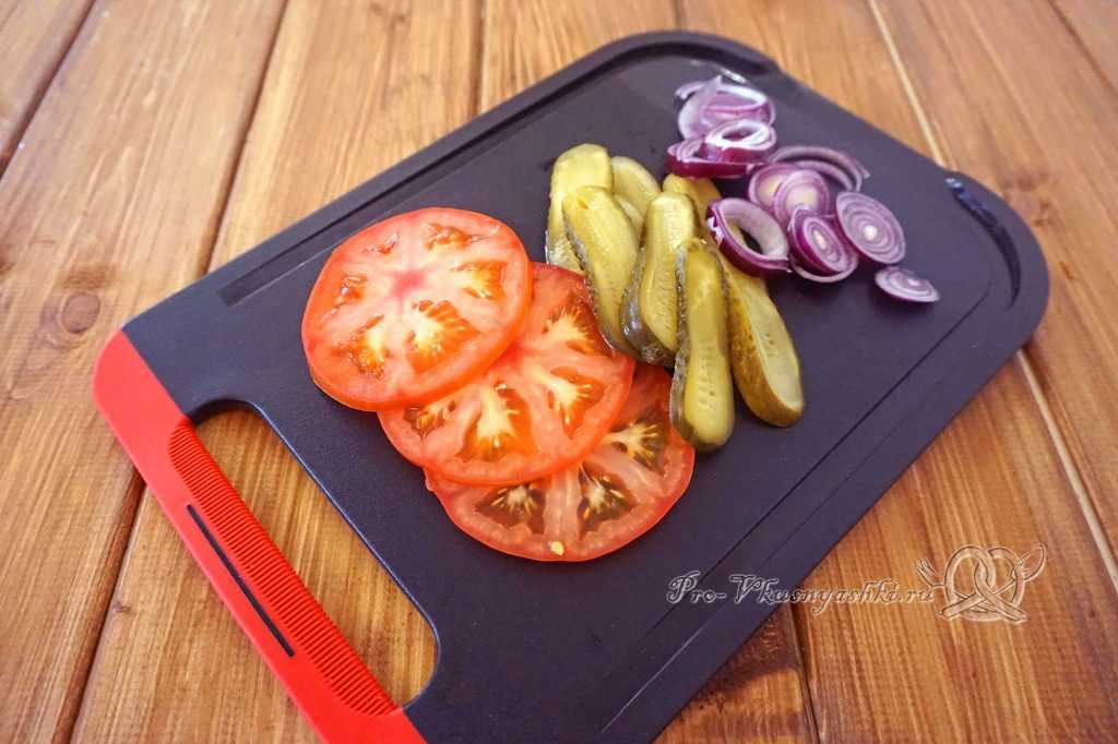 Оставшиеся овощи тонко режем. Томаты — кружочками, огурцы — ломтиками, лук — кольцами.