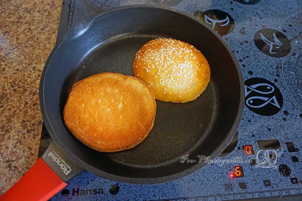 Булочки разрезаем напополам, на сухой, горячей сковороде подсушиваем их срезом вниз до румяной корочки.