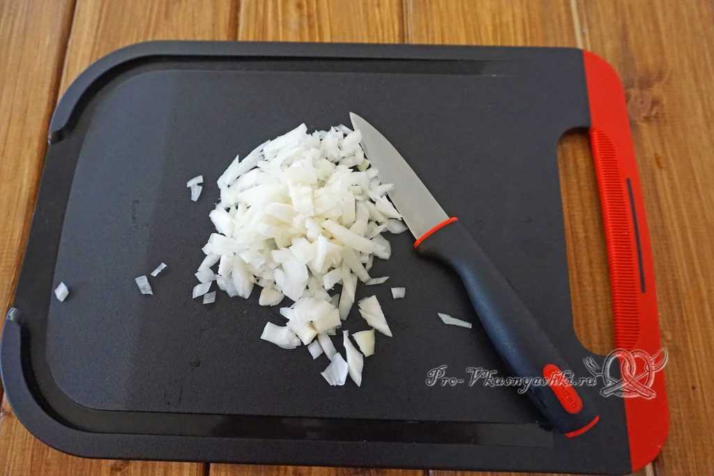 Лук ОЧЕНЬ мелко нарезаем и маринуем в смеси уксуса и кипятка в течение 15-ти минут. Затем лук отцеживаем от жидкости.