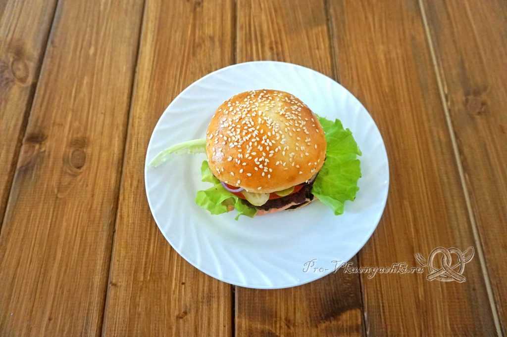 Последний штрих — крышечка из посыпанной кунжутом части булки. Вот и все — гамбургер, приготовленный в домашних условиях, готов.