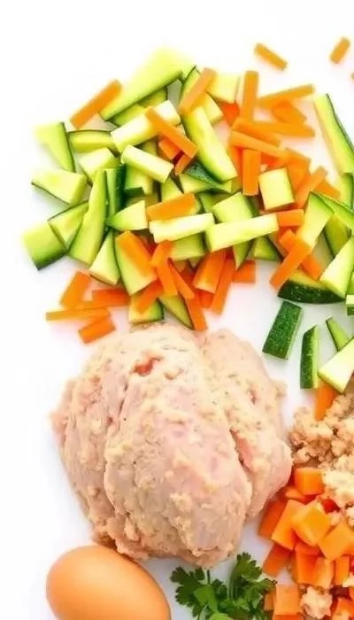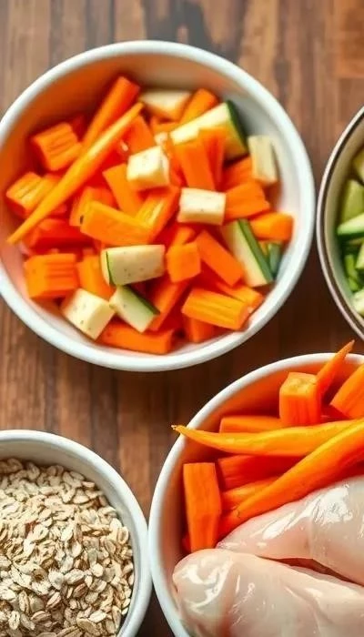 Шаг 1: Подготовка ингредиентов. Вам потребуется 300 г куриного филе, 1 средний кабачок, 1 морковь, 1 яйцо, 2 ст.л. овсяных хлопьев, зелень (укроп, петрушка), соль, перец по вкусу.