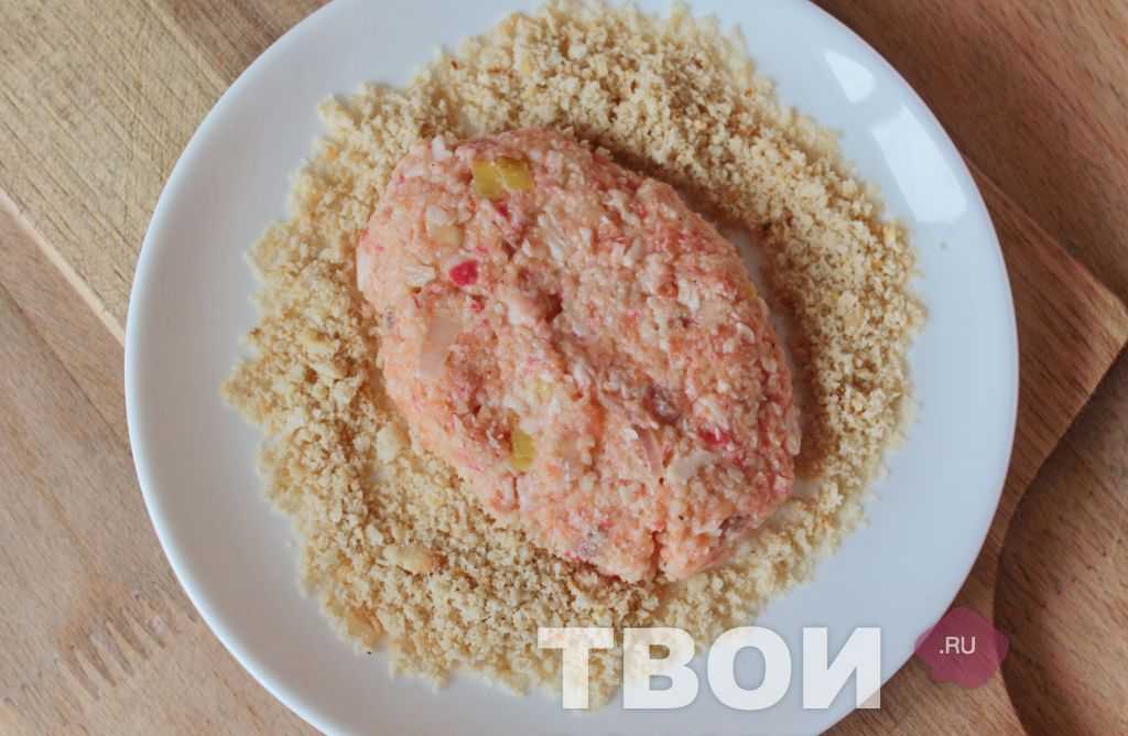 Слепить шар размером с апельсин и слегка приплюснуть сверху. Обвалять в сухарях.