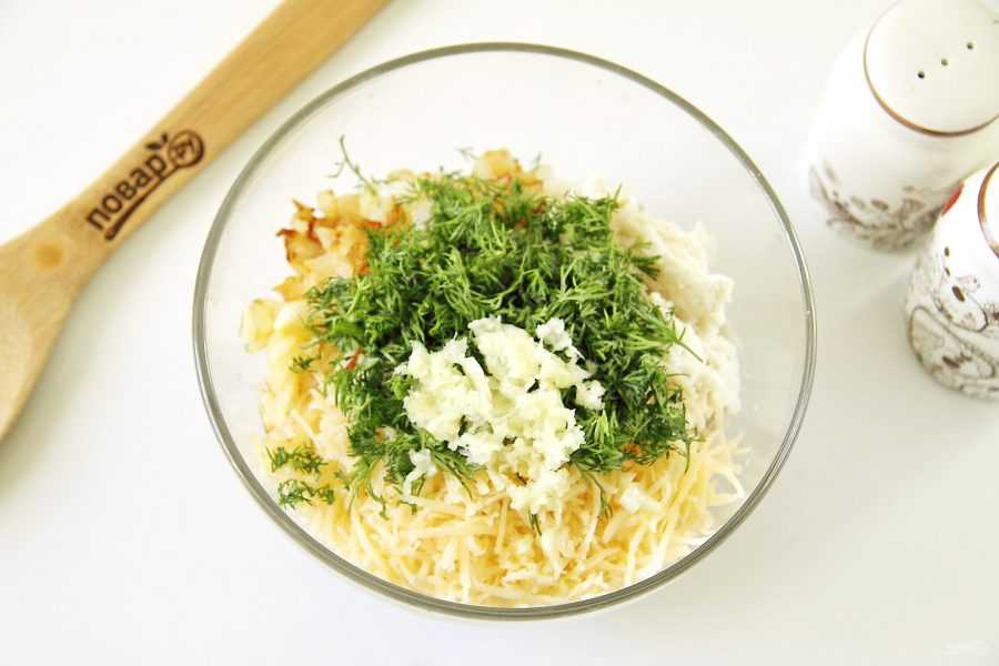 Добавьте к фаршу отжатый хлеб, обжаренный лук, пропущенный через пресс чеснок, измельченную зелень, тертый крупно твердый сыр, соль по вкусу и молотый перец.