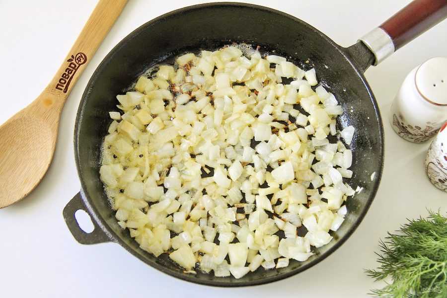 - Разогрейте в сотейнике или казане масло, подрумяньте в нем лук.