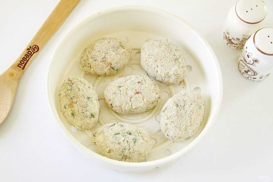 Сформируйте мокрыми руками котлеты, обваляйте их в сухарях и выложите в смазанный маслом контейнер пароварки.