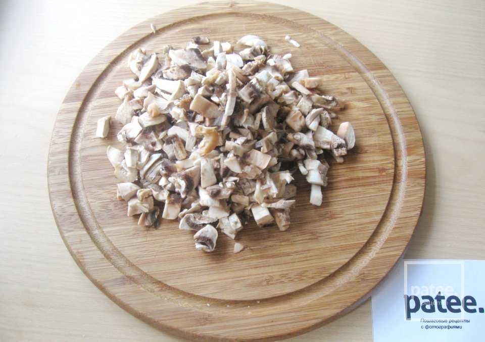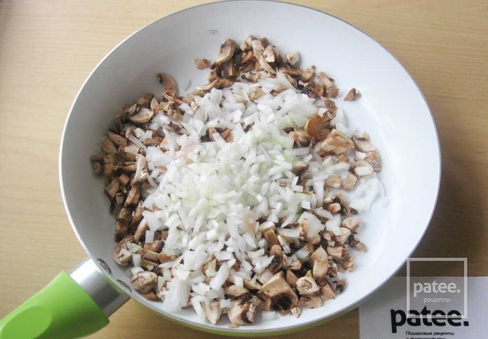 - Грибы и лук нарезать небольшими кубиками и обжарить на растительном масле в течение 10-15 минут.