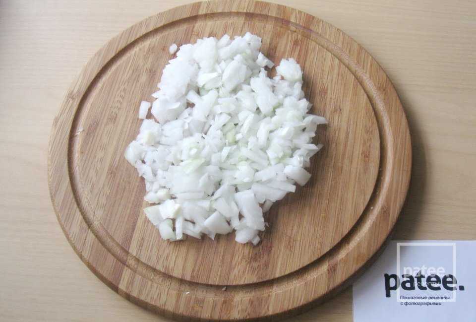 Лук чистим, моем и мелко нарезаем кубиком. Берем одну большую или две небольшие луковицы.