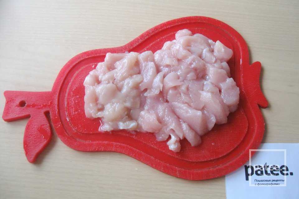 Филе куриной грудки нарезаем ножом небольшими кусочками. Очень мельчить не надо. В противном случае вы получите тот же мясной фарш. А нам этого не надо в данном случае.