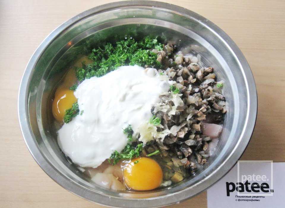 Перемешиваем все ингредиенты: куриное филе, лук, грибы, чеснок, яйца, сметану и зелень.