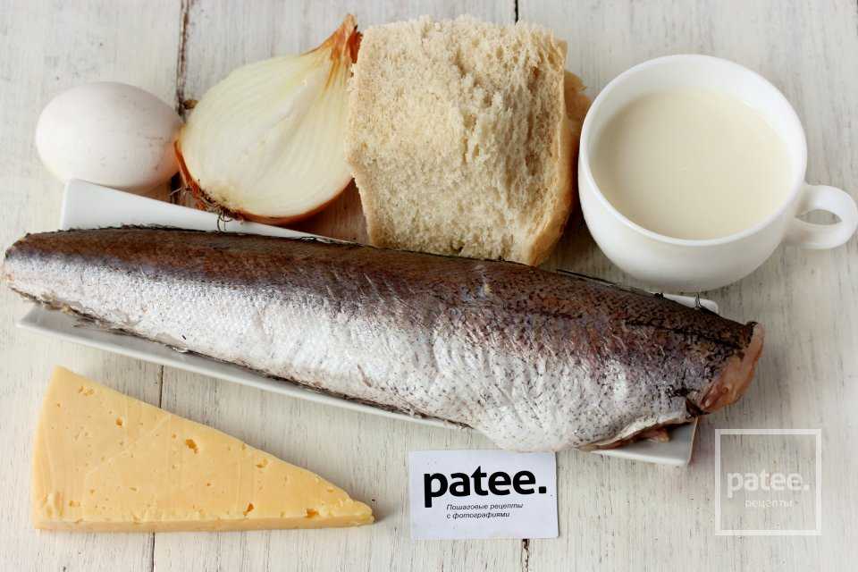 Для приготовления вкусных и полезных паровых рыбных котлет в мультиварке нам понадобятся следующие ингредиенты: тушка малокостистой рыбы (в данном случае- хек), твёрдый сыр, репчатый лук, куриное яйцо, молоко, пшеничный хлеб, соль, чёрный молотый перец.