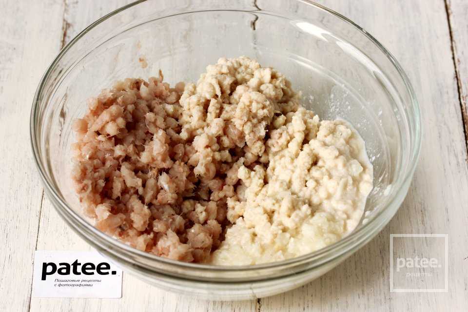 1. Блендером или на мясорубке с мелкой сеткой, измельчаем рыбное филе и луковицу.