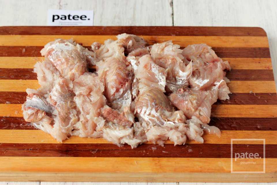 Снимаем кожу с филе хека и нарезаем мякоть небольшими кусочками.