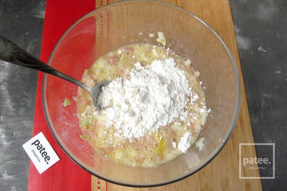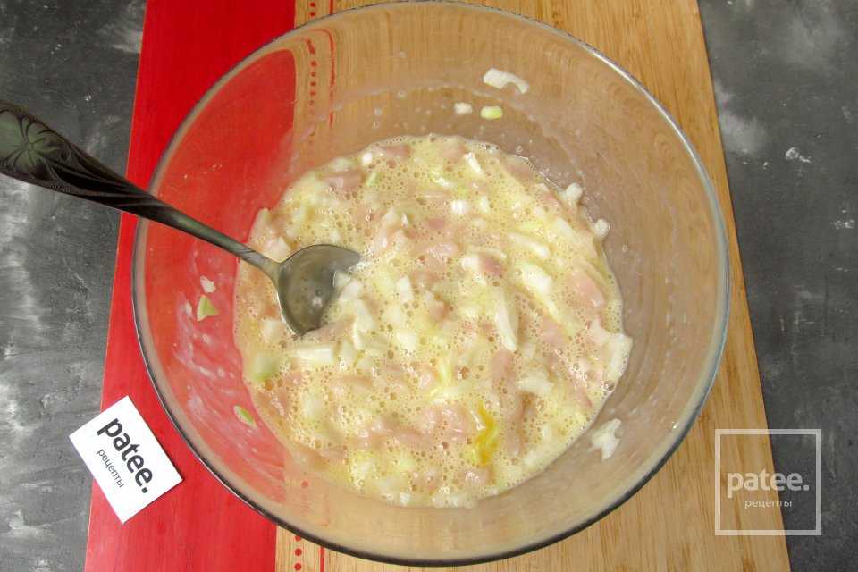 - Ввести в массу яйцо, посыпать крахмалом, отрегулировать вкус солью и приправами.