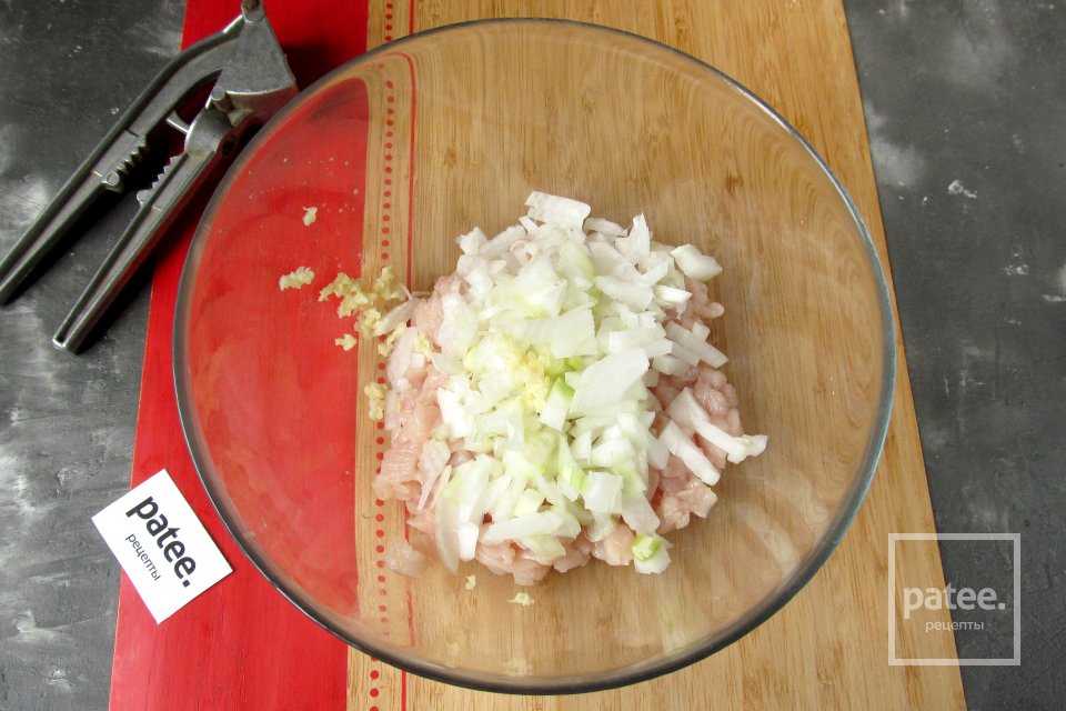 В миску с куриным мясом и луком добавляем крупный зубчик чеснока, пропущенный через пресс.