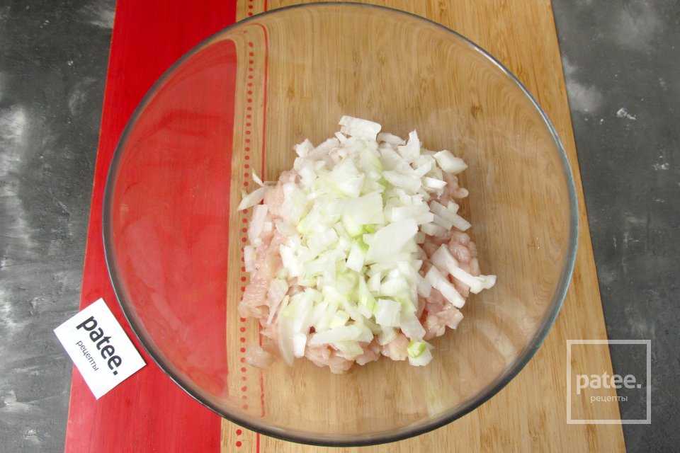 - Репчатый лук почистить, мелко нарезать. Помыть, обсушить бумажным полотенцем куриную грудку, нарезать кубиками небольшого размера.