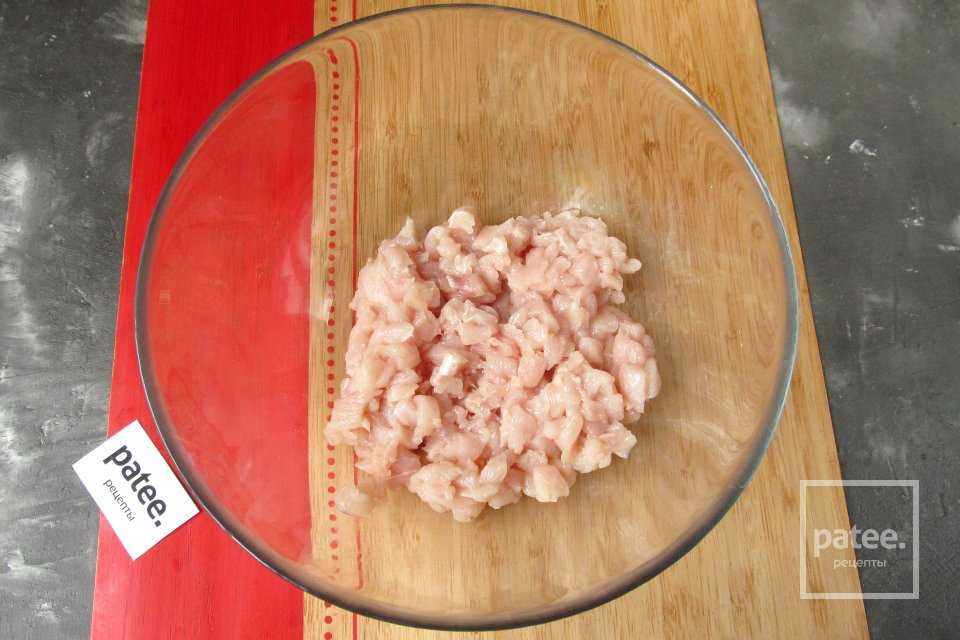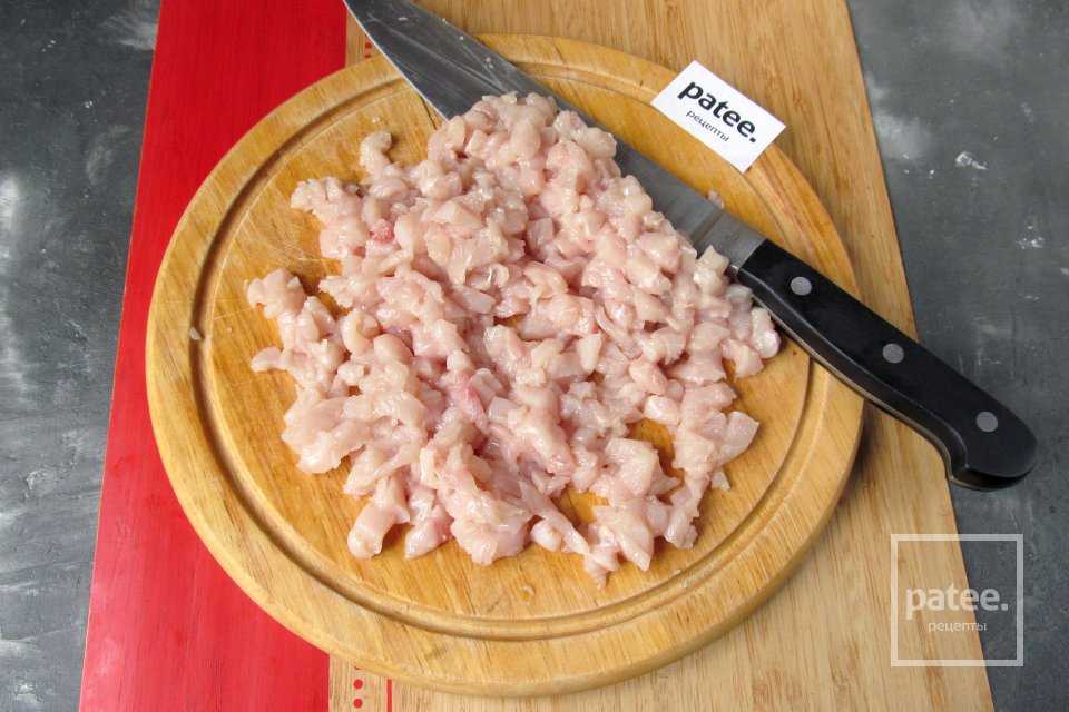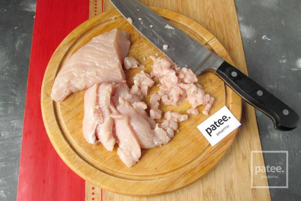 - Части грудки курицы освободить от хрящей и пленок, порезать мякоть мелкими кусочками.