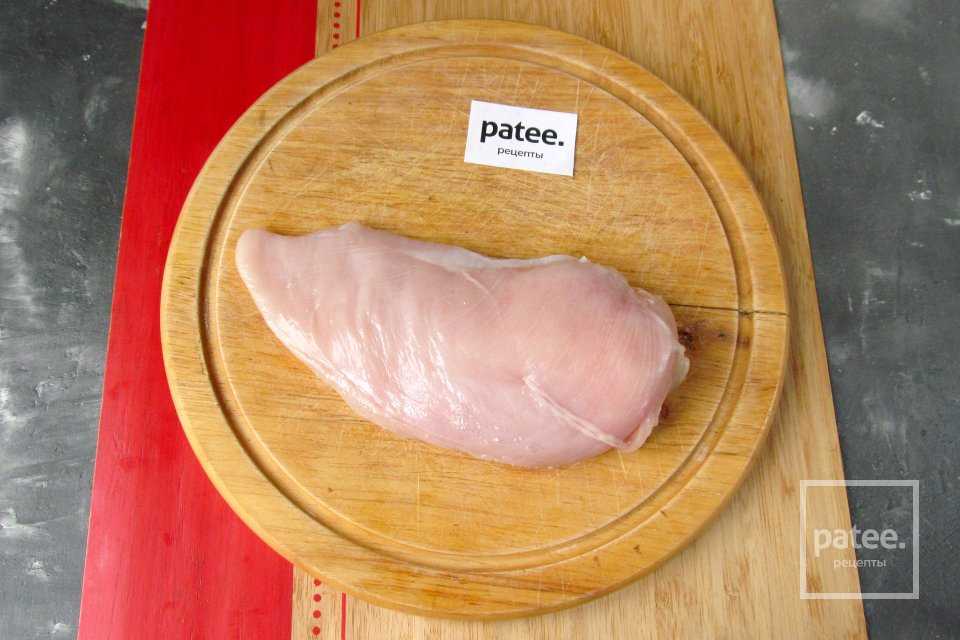 Филе куриной грудки без кожи промываем и просушиваем с помощью бумажного полотенца. Выкладываем куриное филе на разделочную доску.