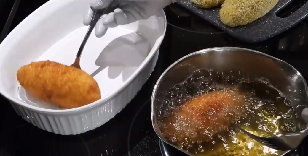 - Обвалять каждый рулетик в муке, затем во взбитом яйце и в панировочных сухарях. Затем снова в яйце и в сухарях.