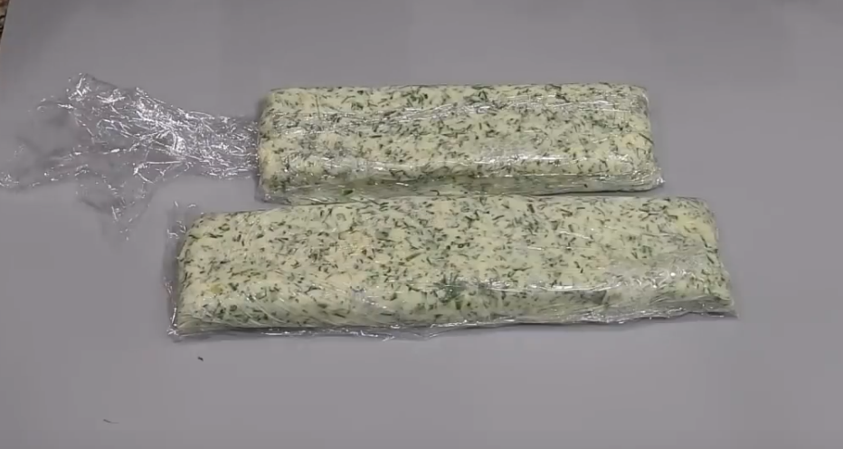 - Приготовьте зеленое масло, растопив его и соединив с мелко порубленной зеленью. Сложите в пакет, сделав длинную колбаску. Отправьте в морозилку.