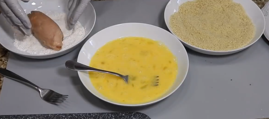 - Яйца разбиваем в отдельной посуде венчиком, насыпаем в отдельные тарелочки муку и панировочные сухари.