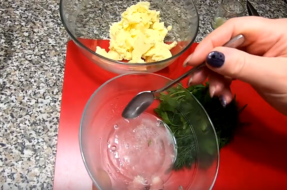 Накануне подготовим масло для фарширования грудки: размягченное масло смешаем с рубленой зеленью, солью и соком лимона, завернем в фольгу и оставим в холодильнике до полного застывания.