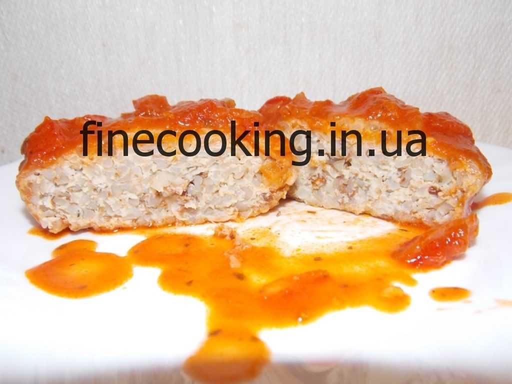 Жареные гречаники — еще не совсем готовы. Для сочности и лучшей термической обработки в середине нужно их протушить в томатном соусе. Слегка разбавляем соус водой, котлеты складываем в сотейник, заливаем томатом и тушим под крышкой на небольшом огне. Примерно через 15 минут после закипания соуса куриные котлеты с гречкой будут полностью готовы к употреблению.