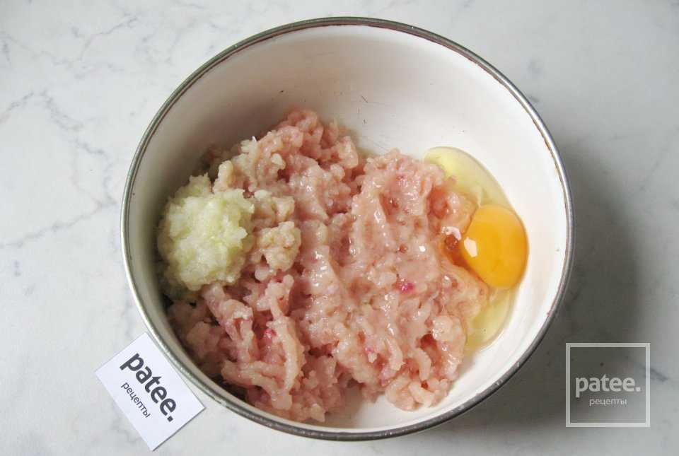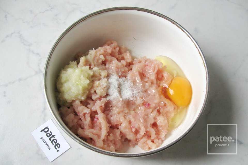 Добавляем в куриный фарш одно яйцо и соль по вкусу. Все тщательно перемешиваем.