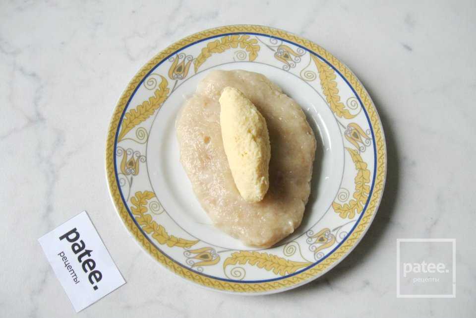 - Затем лепят котлеты. Из сырно-масляной смеси формируют маленькие колбаски, которые кладут на лепёшки, сделанные из фарша.
