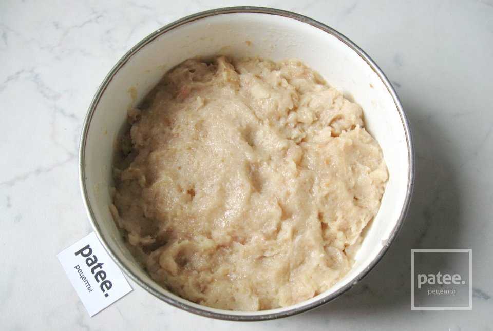 - Потом в охлаждённый фарш добавляют муку и сметану. Массу тщательно смешивают, слегка отбивают.