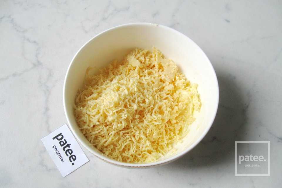 - Прежде всего, необходимо сделать начинку. Сыр с маслом трут на тёрке. Их смешивают и отправляют в холодильник.