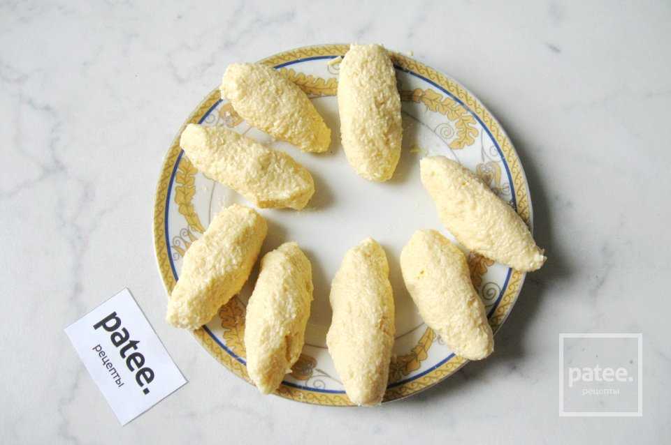 Сыр с маслом перемешиваются. Из массы скатываются удлиненные комочки. Сырные комочки на 10 минут отправляются в морозилку.