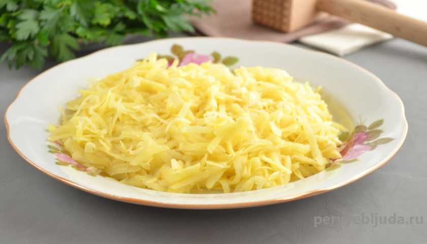 - Сперва нам нужно подготовить картофель – из него мы будем удалять лишний сок, а потому очищаем клубень, после чего натираем на самой мелкой терке. Даем картофельной массе немного постоять.