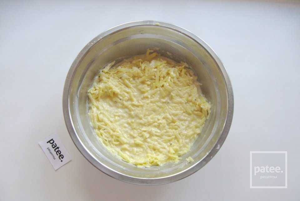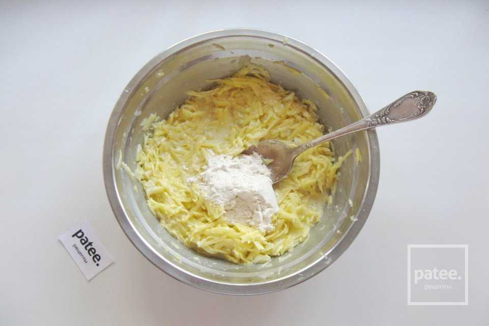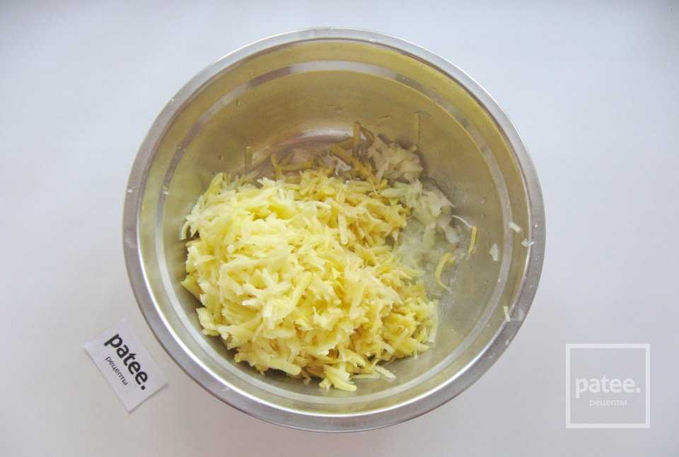 - Картофель очищаем от кожуры, споласкиваем, трем на мелкой терке. Отжимаем, вводим 1 ст.л. муки. Хорошо мешаем до однородного состояния.