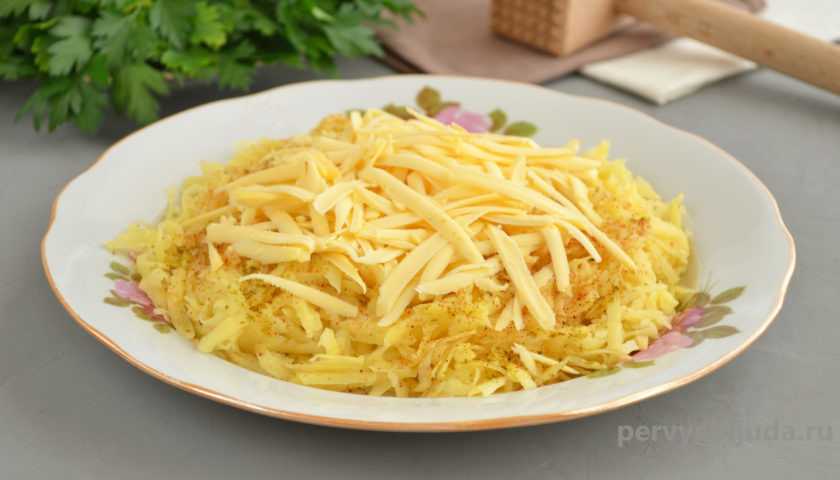 6. Твердый сыр крупно натираем и добавляем к картофелю.