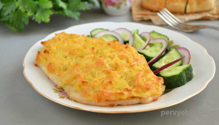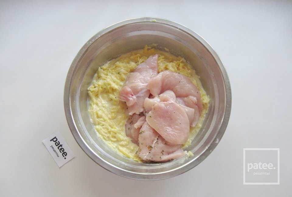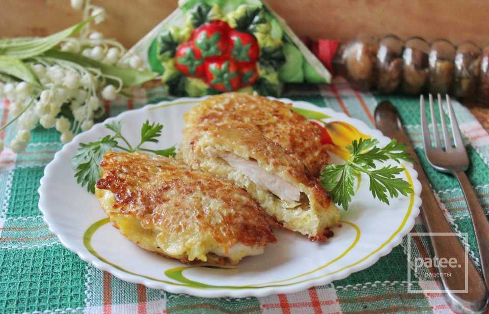 9. Смесь из картошки и сыра слегка отжимаем (на дне миски образуется жидкость), делим на 2 части и выкладываем на отбитые кусочки грудки, отступая немного от краев. Противень ставим в духовку, которую включаем на 210 градусов за 10 минут до начала приготовления, и готовим 30-35 минут, пока картофельная шуба не покроется золотистой красивой корочкой. За это время отбивные приготовятся, пропитаются соками от картофельной смеси, станут очень нежными и вкусными.