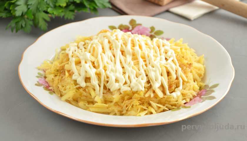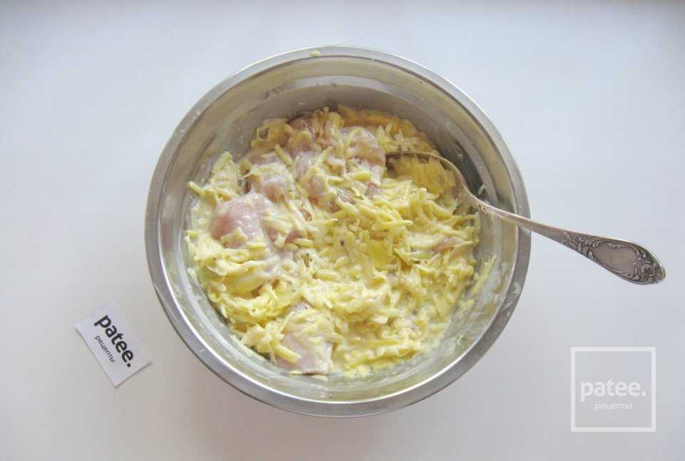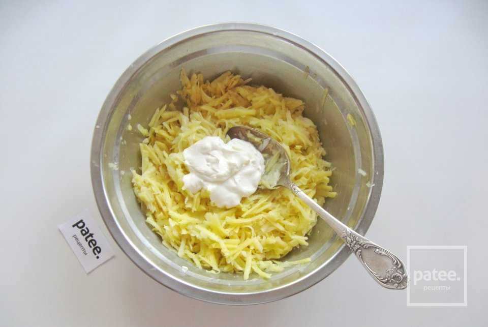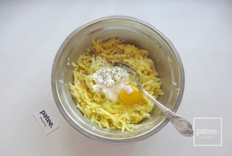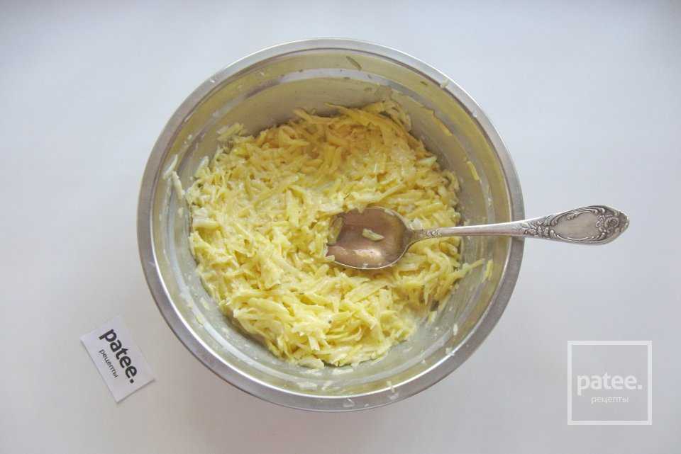 Картофель 1 кг почистить, натереть на тёрке, хорошо отжать от выделившейся жидкости, добавить 1 ст. л. майонеза, 1 яйцо, соль 0,5 ч. л. и перец по вкусу. Смесь перемешать.