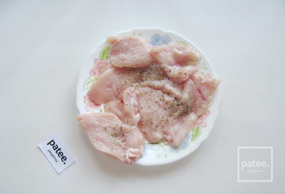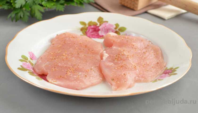1. Филе грудки промываем, просушиваем бумажным полотенцем, разрезаем длинным ножом на 2 половинки, посыпаем с 2 сторон солью и молотыми семенами кориандра. Семена можно измельчить пестиком в ступке.