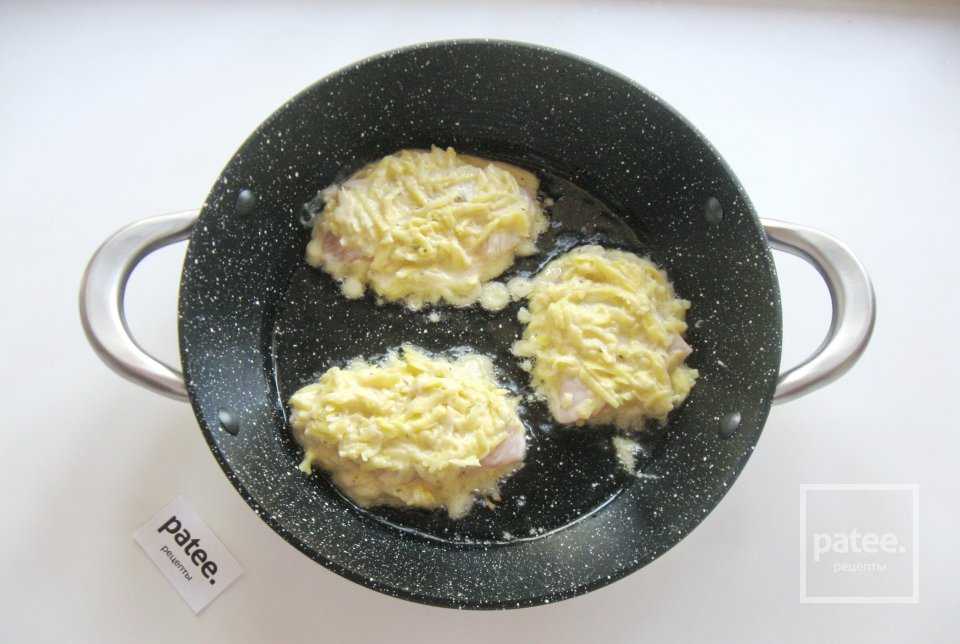 • Куриное филе под шубкой можно не только запечь в духовке, но и обжарить на сковороде в масле. В сковороду с маслом выкладываем картошку с сыром, формируя 2 лепешки (по ¼ части смеси). На смесь выкладываем отбивные и закрываем их сверху остатками измельченного картофеля. Накрываем и готовим на средней температуре с 2 сторон, пока смесь не покроется коричневой хрустящей корочкой. Количество картофеля увеличиваем до 5 штук.