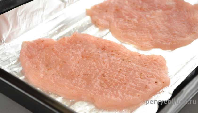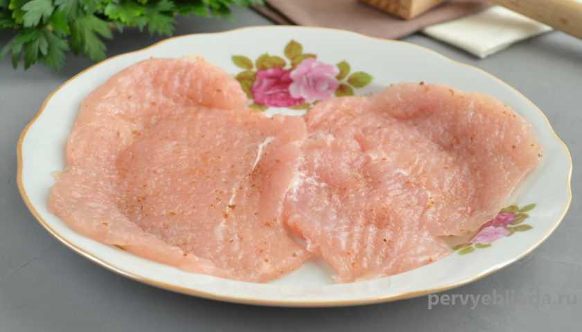 - Филе споласкиваем в проточной воде, очищаем от костей, пленок. Режем вдоль на порционные куски. Хорошо отбиваем молоточком, перчим, солим, посыпаем указанными специями.