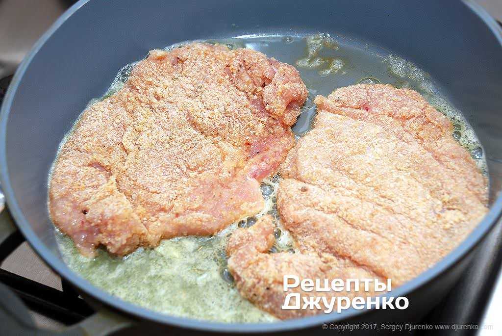 Чтобы пожарить шницель, я хорошенько разогреваю сковороду с растительным маслом. Сковородка должна быть нагрета докрасна, чтобы горячее масло сразу схватывало панировку и на поверхности шницеля образовывалась корочка, запечатывающая внутри все соки. Масла можно не жалеть. Я обжариваю шницели на среднем огне, до хрустящей корочки с каждой стороны примерно по 5 минут. Свинина должна прожариться полностью. Прожарка «медиум», как в случае с говяжьими стейками, не подходит! Если сомневаетесь в абсолютной готовности, то можете добавить в сковороду кусочек сливочного масла, прикрыть крышкой и потомить 2-3 минуты. Как вариант можно также довести до готовности в жарочном шкафу при температуре 250-280 градусов в течение 5 минут.